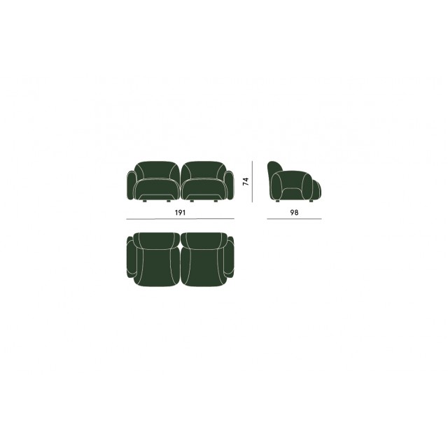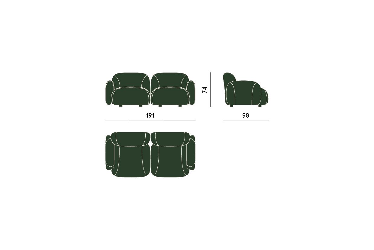 Bubble a due posti è un divano dalle dimensioni contenute composto da due elementi imbottiti con bracciolo, la cui presenza scenica è dichiarata dalle forme accoglienti e dalle proporzioni studiate nel minimo dettaglio.