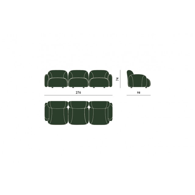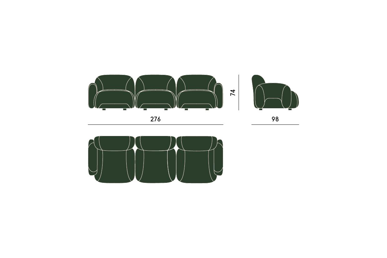 Bubble a tre posti è un divano composto da tre elementi imbottiti con braccioli laterali, la cui presenza scenica è dichiarata dalle forme accoglienti e dalle proporzioni studiate nel minimo dettaglio.